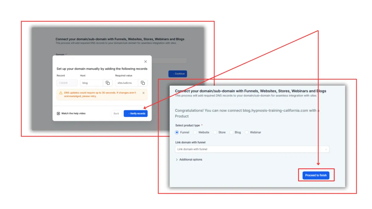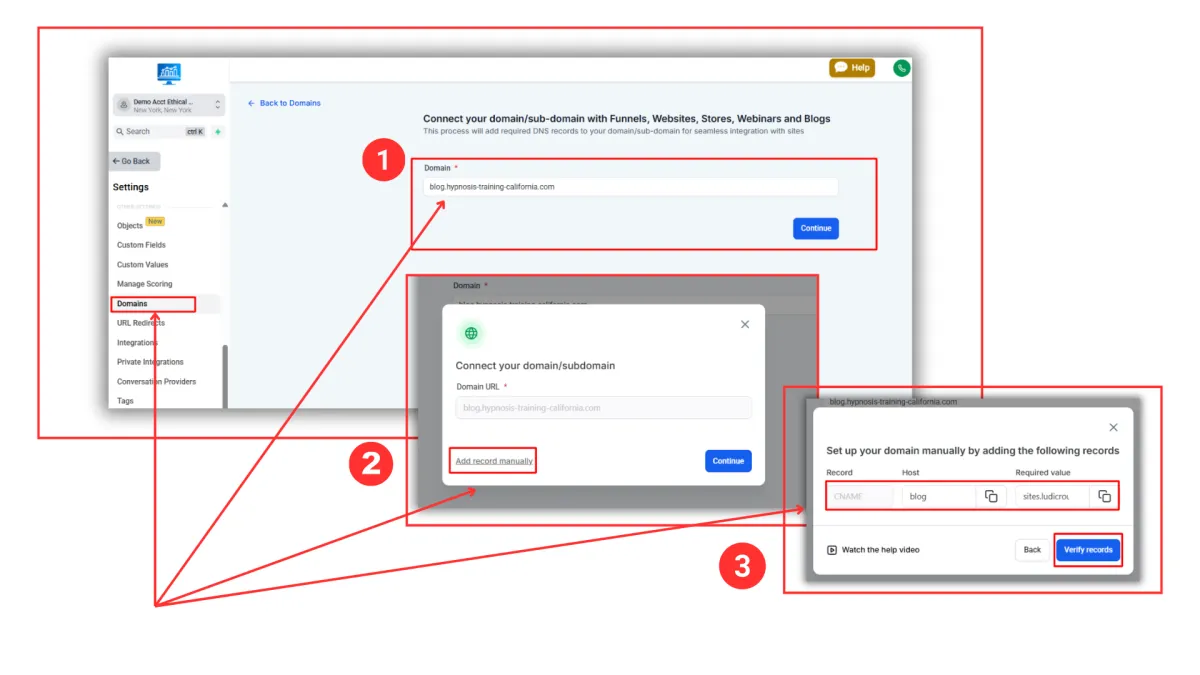 Step 3: Login to your domain registrar, locate your domain, go to DNS, and click on “Add a new record”. Simply copy and paste the records that are given to you by the CRM, and once done, click on “Verify records”. Give it a minute for your work to save.